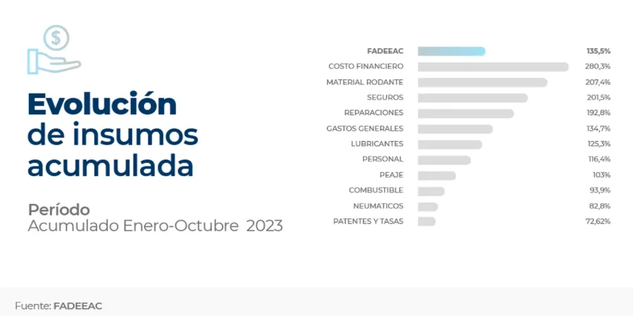 Octubre fue el quinto mes del año en el que se registró un incremento de costos de dos dígitos (febrero, 10,02%; mayo, 11,85%; agosto, 20,3% -la variación mensual más significativa de los últimos 20 años-; y septiembre, 11,1%). El mes pasado, 8 de los 11 rubros que integran el Índice de Costos del Transporte (ICT) registraron subas.