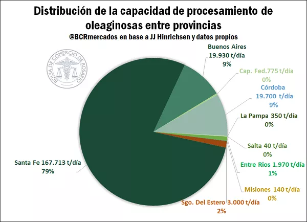 Tomando las plantas con mayor capacidad de procesamiento y cuya información se encuentra disponible, de acuerdo con datos relevados desde la Dirección de Informaciones y Estudios Económicos de la Bolsa y datos provistos por la Corredora-Broker J.J. Hinrichsen S.A., nuestro país cuenta con una capacidad instalada total (plantas activas e inactivas) para procesar diariamente 213.600 toneladas de semillas oleaginosas, lo que corresponde a casi 70,5 millones de toneladas anuales, superando con creces la producción total de los principales cultivos de oleaginosas en el país (soja, girasol, canola, entre otras).