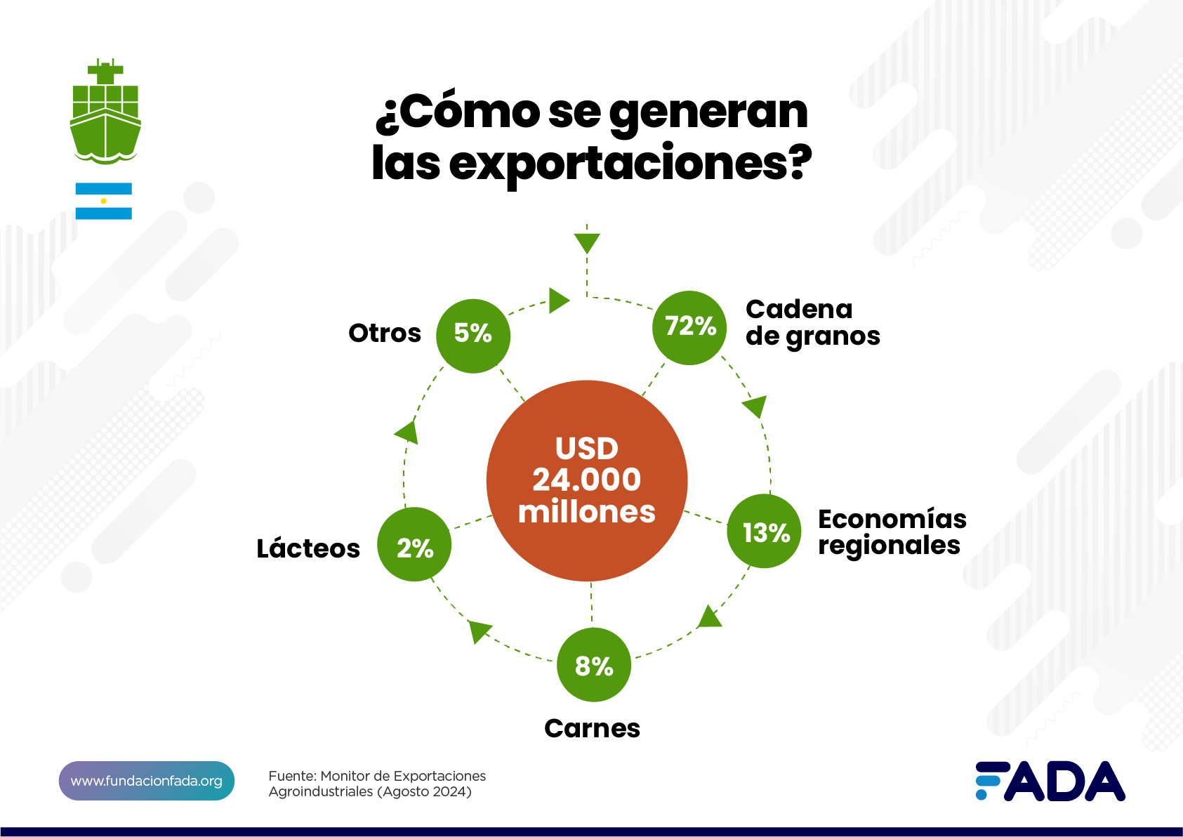 Al analizar cómo se reparten las exportaciones, el Monitor indica que el 72% proviene de las cadenas de granos, 13% de economías regionales, 8% carnes, 2% lácteos y 5% otros.