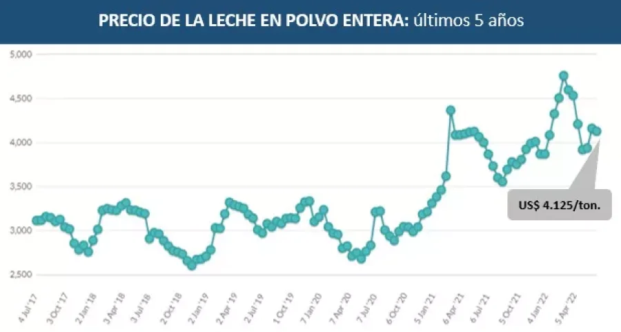 Según consigna el Observatorio de la Cadena Láctea Argentina, “en el mes de marzo de 2022 se dio el valor promedio mensual más alto desde 2013 (4.600 US$/ton), luego hubo dos meses de caída y en este mes de junio el precio promedio de la LPE rebotó a un valor de US$ 4.142/ton”.