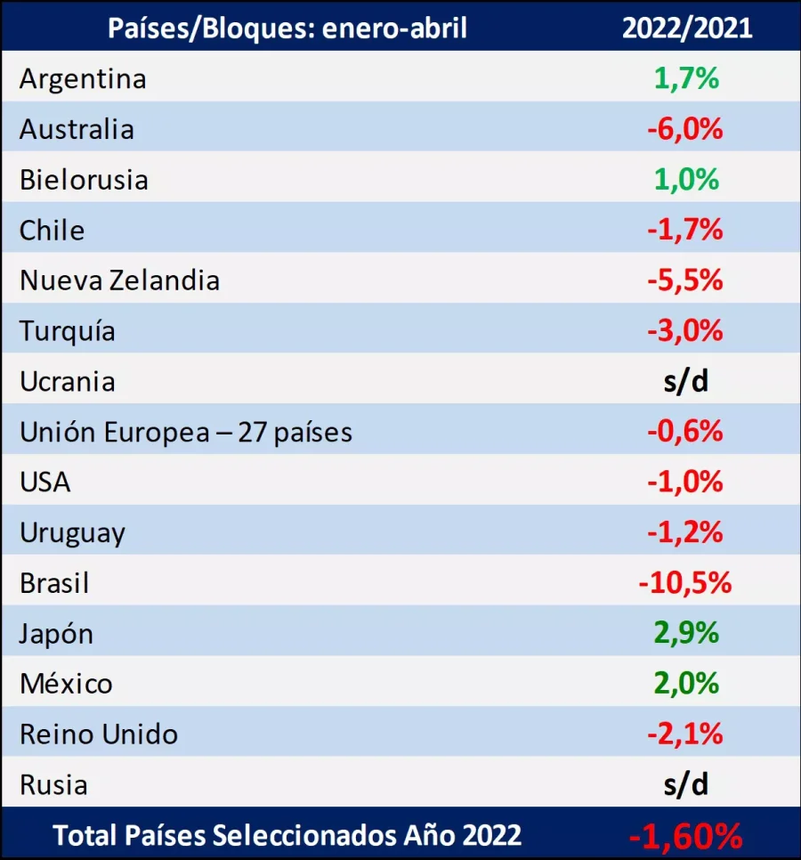 Según analiza el observatorio el panorama de producción mundial, “la Unión Europea, que presentó valores negativos para el año 2021 y comenzó de igual forma el 2022, si bien revirtió en febrero la tendencia, vuelve a descender en marzo y abril. A diferencia de Europa, Estados Unidos que tuvo valores positivos en 2021, presenta un ratio negativo para los cuatro primeros meses de 2022”. Los valores negativos de Estados Unidos y de la Unión Europea, que por su representatividad en el volumen total definen el número global, “son ahora acompañados por varios países que también presentan porcentajes de variación interanual negativa”, a saber: Brasil, Nueva Zelanda, Reino Unido, Turquía, Australia y Uruguay, entre otros países importantes para el mercado lácteo.