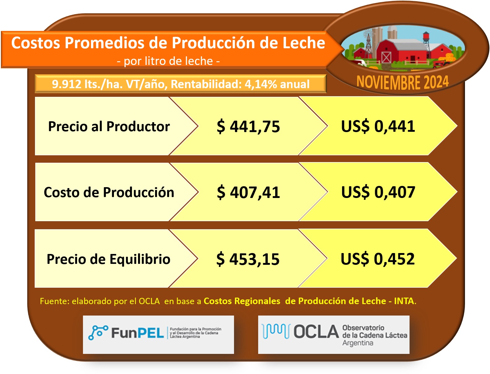 Según el informe “Costos Regionales de Producción de Leche, valores actualizados a noviembre”, que publica el Observatorio de la Cadena Láctea Argentina (OCLA), el productor está percibiendo por su materia prima un valor histórico en dólares: 44 ctvs de dólar/litro.