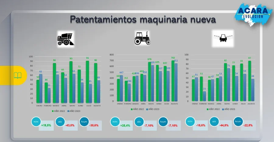 La División de Maquinaria Agrícola la Asociación de Concesionarios de Automotores de la República Argentina (ACARA) confirmó que los patentamientos de cosechadoras, tractores y pulverizadoras de agosto de 2023 alcanzaron las 749 unidades, representando una baja interanual del 14,4%, teniendo en cuenta que en el mismo mes del año pasado se habían registrado 875.