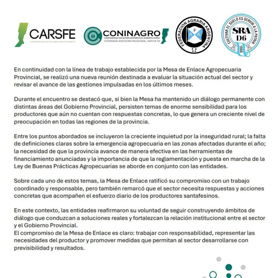 La Mesa de Enlace ratificó su compromiso con un trabajo coordinado y responsable, aunque advirtió que el sector “necesita respuestas y acciones concretas que acompañen el esfuerzo diario de los productores santafesinos”. En este sentido, renovó su voluntad de promover ámbitos de diálogo que conduzcan a soluciones reales y fortalezcan la relación institucional entre las entidades y el Gobierno provincial.