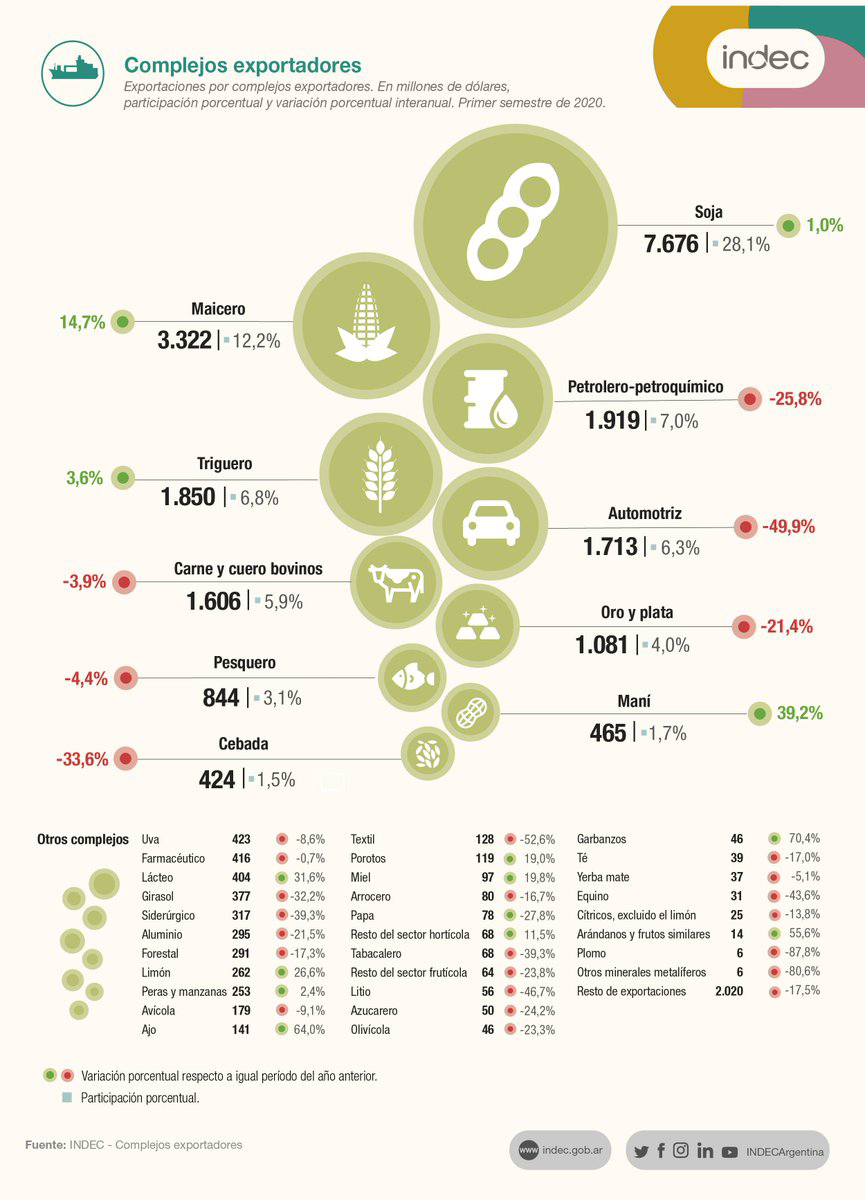 De esta forma, los sectores oleaginoso (soja, maní, girasol y sus derivados) y cerealero (maíz, trigo, cebada y arroz, entre otros) pasaron a representar más de la mitad de las ventas al resto del mundo. En el primer semestre de 2019 reunían el 45,4%, en el mismo período de 2020 alcanzaron el 52,1%.