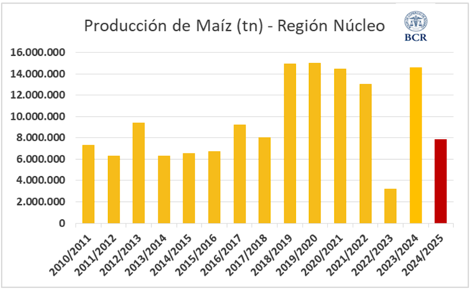 La producción de maíz ahora se estima en 7,8 Mtn, 300.000 tn menos que la anterior estimación (8,1 Mtn en enero 2025). La recomposición de lluvias durante febrero llegó tarde para los maíces que padecieron la falta de agua en momentos críticos como la floración y el llenado de granos. Los mayores ajustes se dieron en el norte de Buenos Aires, que fue la zona más afectada por la falta de agua durante diciembre y enero.