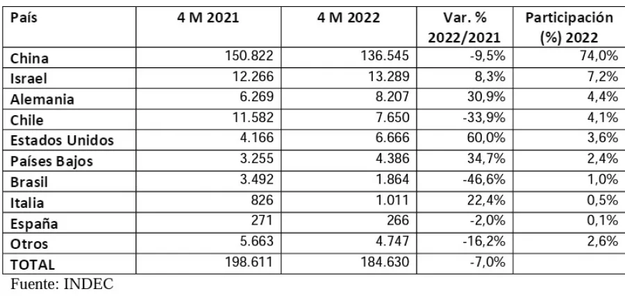 La dependencia del mercado chino para las exportaciones de carne bovina de Argentina se volvió “determinante” y en el último mes de abril de 2022, fueron 33.700 toneladas, que representaron aproximadamente un 72,2% de los envíos. Israel, con 3.200 toneladas se convirtió en el segundo destino de mayor relevancia, en término de volúmenes, en el cuarto mes del año.