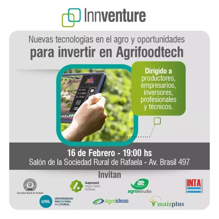 Rafaela será hoy sede de una charla de negocios en la que se abordará el impacto de las nuevas tecnologías en las cadenas agroalimentarias y nuevas opciones de inversión en agrifoodtech que, con la organización de Innventure, estará destinado a productores, empresarios, profesionales e inversores entre otros.