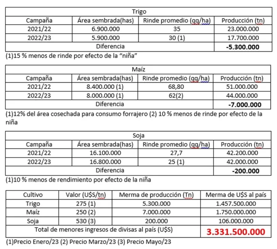 Según estima el referente técnico, “por una menor producción en los tres principales cultivos en la campaña 2022/23 (en relación a la campaña 2021/22) y menores valores en los precios futuros de los granos para el año 2023, el país tendrá una merma de ingreso en dólares (al ser la pérdida todo saldo exportable) de U$S 3.331 millones”.