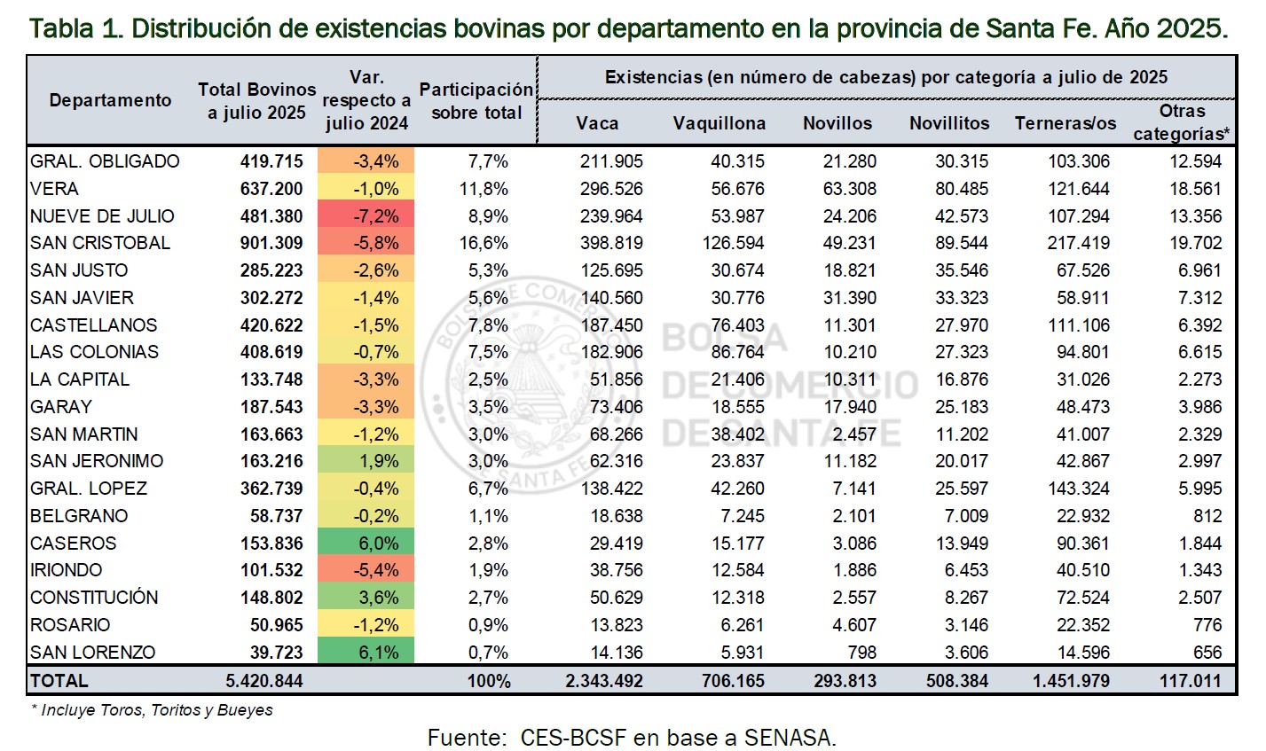 Según el Servicio Nacional de Sanidad y Calidad Agroalimentaria (SENASA), en la provincia de Santa Fe se contabiliza en julio de 2025 un stock de existencias bovinas que rondaba las 5.420.844 cabezas, representando un 12% del total nacional, una participación similar a los años previos.
