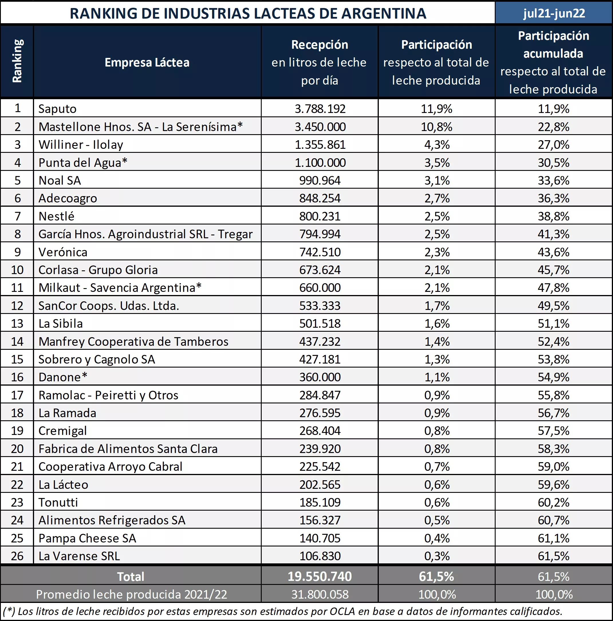Por secreto estadístico, no es posible contar con la información de la DNL - MAGyP respecto a los litros recibidos por cada industria. Por defensa de la competencia tampoco se puede solicitar a las cámaras empresariales respectivas esta información. Por estos motivos, el OCLA solicitó directamente a 30 empresas el volumen de leche recibida. En este sentido cabe aclarar que todos los rankings internacionales se realizan sobre la base de leche recibida y o facturación (IFCN, Rabobank, FIL, etc.).