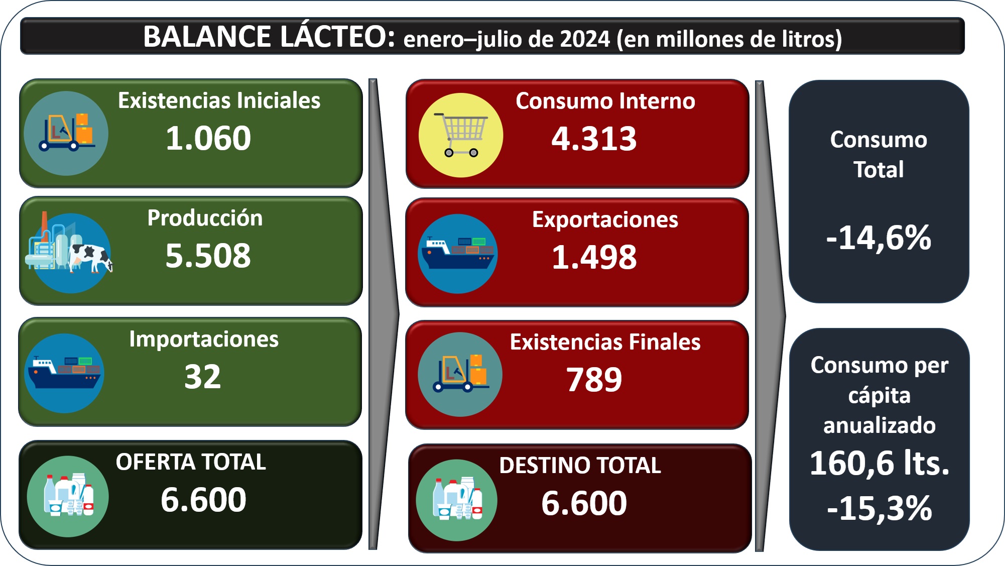 También se dieron a conocer esta semana, los valores de producción, existencias, importaciones y exportaciones según información oficial, para calcular por diferencia el consumo de lácteos. Para el período enero-julio del 2024 determinó una caída de consumo doméstico total del 14% y del 15% en el consumo per cápita, siempre medido en litros de leche equivalentes y en esta oportunidad corregido en cantidad días del período, lo que significa una mejora de 2,3 puntos porcentuales respecto al balance acumulado al mes de junio.