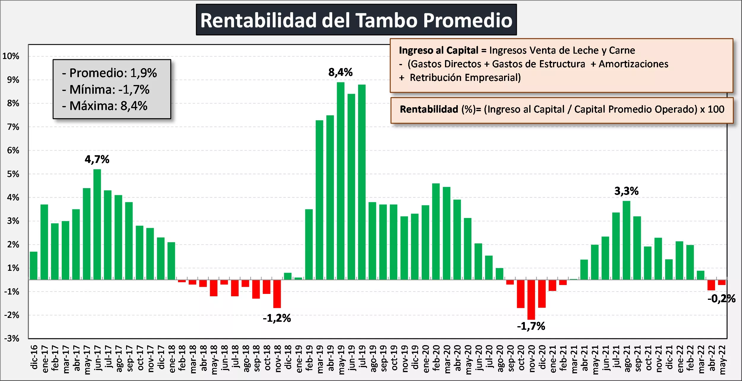 “En el período analizado (dic. 16 - may. 22) la tasa de rentabilidad promedio fue del 1,9% con un máximo del 8,4% y un mínimo de -1.7%”, comunicó el observatorio. Para comprender si este porcentaje es suficiente o no, analizando un período tan prolongado en un negocio de ciclos largos como la lechería, el OCLA hace algunas aclaraciones terminológicas que conviene entender.