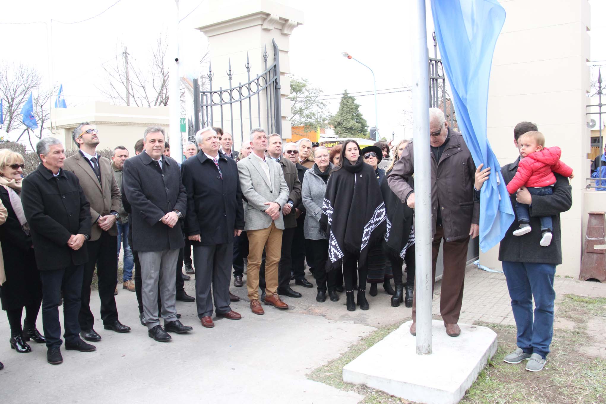Luego se hizo el tradicional corte de cintas a cargo de Rostagno, Martínez y Castellano. Ya dentro del predio, el izamiento de la bandera fue realizado por Egidio Vincenti (ex presidente de la entidad de 1985-87) y socio más antiguo con 94 años junto con el bebé Constantino Alassia de 10 meses, hijo del dirigente Leonardo Alassia. El himno nacional fue ejecutado por los músicos Facundo Rubino (trompeta) y Evelyn Chiavassa (saxo tenor). La ofrenda floral estuvo a cargo de dos ex combatientes de Malvinas. Finalmente las autoridades presentes recorrieron la muestra.
