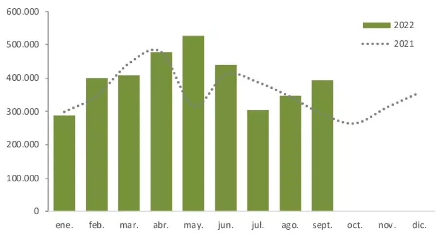 De acuerdo a los datos que muestran los DTe para el movimiento de animales, sobre el traslado de hacienda con destino a establecimientos de engorde a corral, durante agosto y septiembre los ingresos han estado creciendo entre un 13% y 14% mensual, alcanzado en septiembre ingresos total por 393.000 animales, un 35% más que lo registrando en igual mes del año pasado.